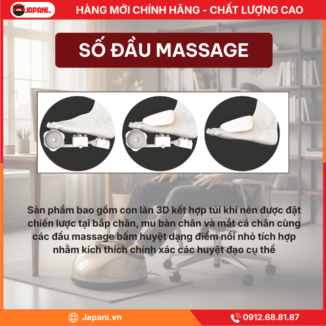 - Trị liệu đa phương thức: Kết hợp đồng thời massage nhào nặn, rung và nén khí, tạo ra một liệu trình toàn diện từ lòng bàn chân đến bắp chân.