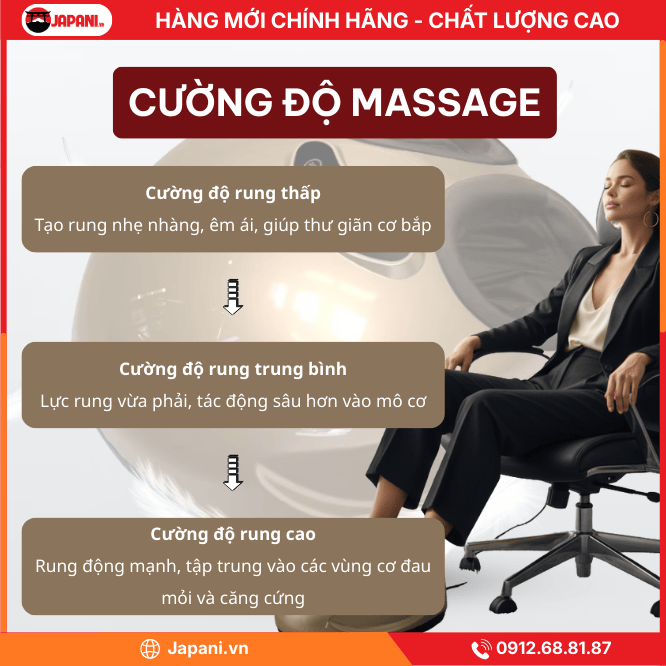 - Cường độ rung cao: Rung động mạnh, tập trung vào các vùng cơ đau mỏi và căng cứng rõ rệt. Mức này giúp giảm đau nhức nhanh, phù hợp cho người lao động nặng, vận động nhiều hoặc cần massage trị liệu chuyên sâu.
