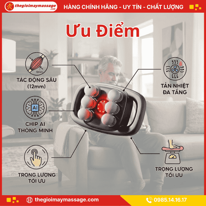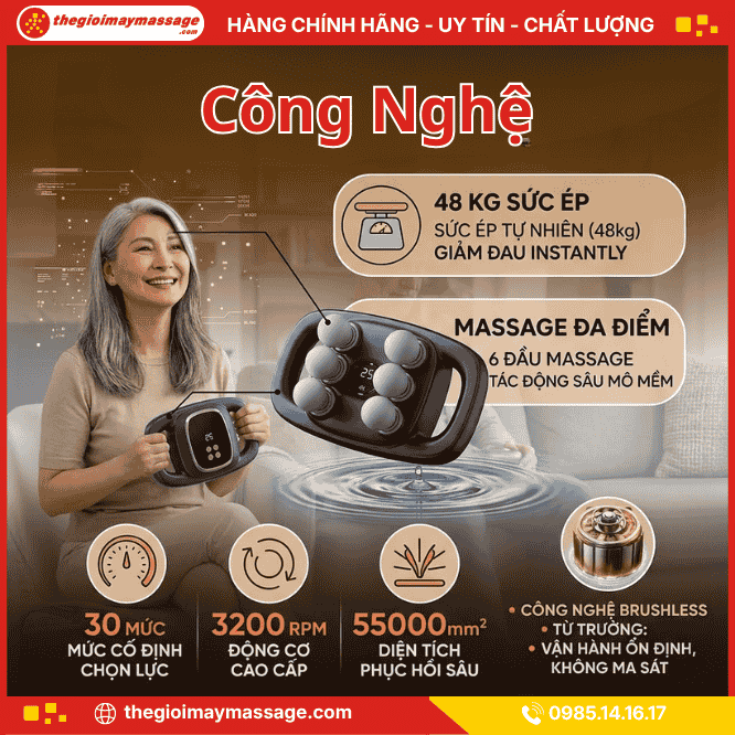 - Công nghệ AI thông minh: Chip xử lý bên trong máy có khả năng nhận diện lực ép từ tay người dùng để điều chỉnh tần số rung phù hợp, đảm bảo an toàn cho các vùng xương khớp nhạy cảm.