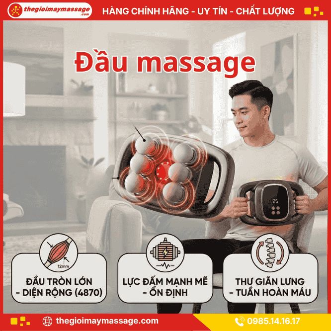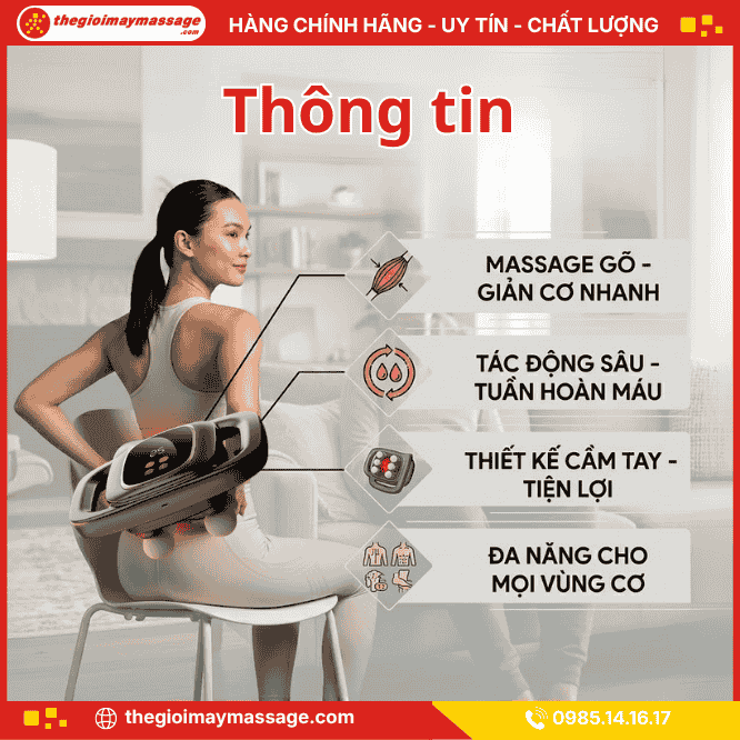 - Tác động sâu vào mô mềm: Với biên độ gõ lên đến 12mm, máy không chỉ tác động trên bề mặt da mà len lỏi sâu vào các bó cơ, giúp phá vỡ các nút thắt cơ nguyên nhân chính gây ra các cơn đau nhức dai dẳng.