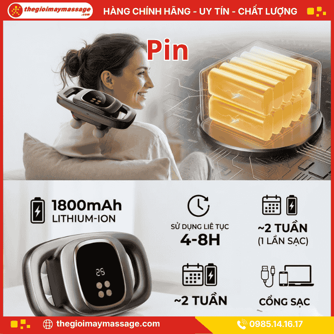 Với mỗi lần sạc đầy (khoảng 2-3 giờ), bạn có thể sử dụng máy liên tục trong 4 – 8 tiếng. Nếu mỗi ngày bạn massage 15-20 phút, thì phải sau 2 tuần bạn mới cần sạc lại một lần. Cổng sạc Type-C chuẩn quốc tế cho phép bạn dùng chung sạc với điện thoại hoặc laptop, cực kỳ tiện lợi khi mang theo đi công tác hay du lịch.