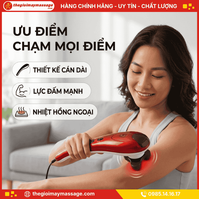 - Thiết kế cán dài: Giúp bạn tự mình massage các điểm mù sau lưng, thắt lưng mà không cần sự trợ giúp của người thân.