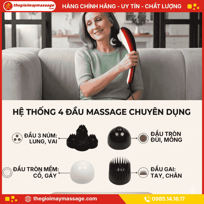 - Đầu massage 3 núm: Tập trung lực vào các điểm huyệt, cực kỳ hiệu quả cho vùng thắt lưng và bả vai.