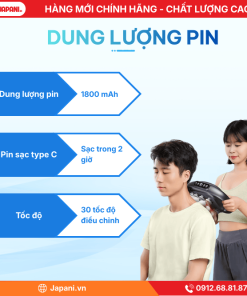 - Pin sạc 1800mAh: Đảm bảo thời gian sử dụng liên tục dài, cho phép người dùng thực hiện các liệu trình massage toàn diện mà không bị gián đoạn.