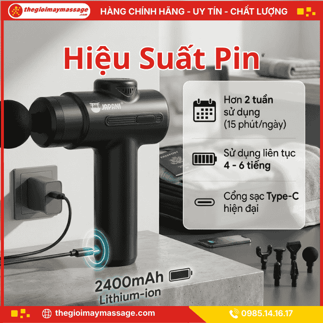 Máy massage cầm tay JAPANI MCT-2443 rung sâu 1200–3500 nhịp/phút, 8 đầu massage, pin 2400mAh, hỗ trợ giảm đau và giãn cơ hiệu quả.