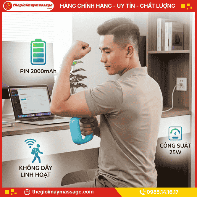 Bên cạnh đó, hệ thống quản lý năng lượng giúp máy hoạt động hiệu quả với công suất khoảng 25W, tối ưu giữa hiệu suất rung và mức tiêu hao pin. Nhờ dung lượng pin lớn cùng thiết kế không dây, người dùng có thể sử dụng thiết bị linh hoạt tại nhà, văn phòng hoặc mang theo khi di chuyển mà không cần phụ thuộc vào nguồn điện trực tiếp.