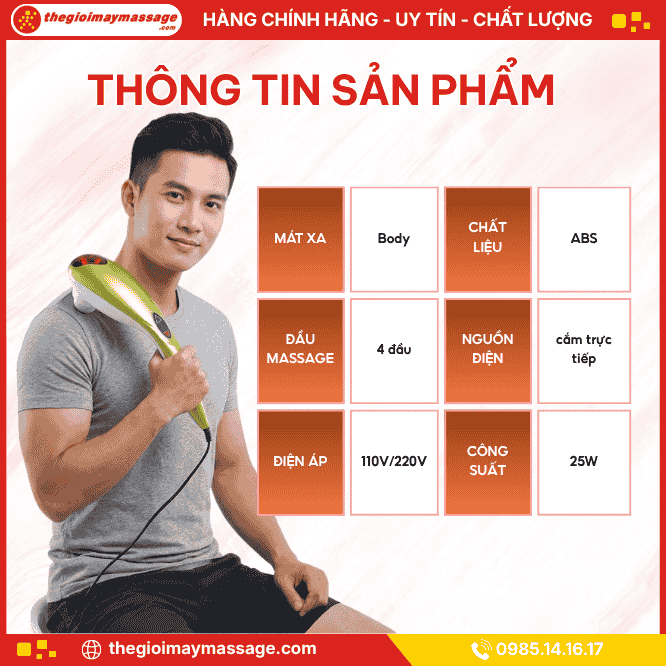 Máy massage cầm tay JAPANI MCT-4519 có 4 đầu massage, 6 mức rung, công suất 25W, dùng điện 110V/220V, thiết kế cầm tay nhỏ gọn giúp massage toàn thân, giảm đau nhức và thư giãn hiệu quả.