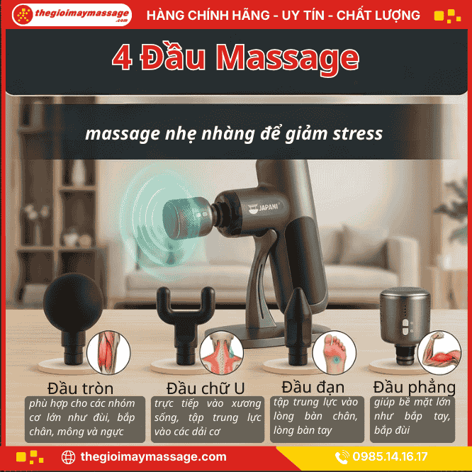 ✔ Sản phẩm đi kèm 4 đầu massage chuyên dụng, mỗi đầu được thiết kế với chức năng riêng, phù hợp cho từng nhóm cơ và từng vùng trên cơ thể.