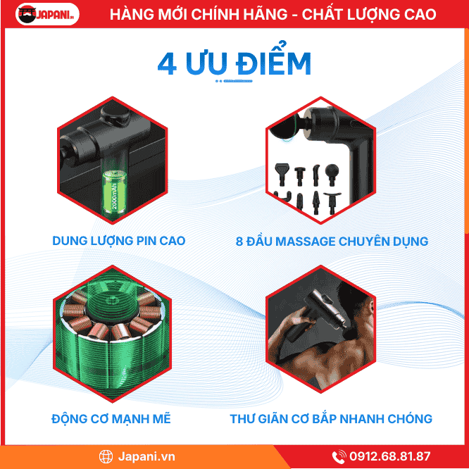 Máy massage cầm tay JAPANI MCT-2443 được trang bị hàng loạt tính năng ưu việt, biến nó thành một công cụ không thể thiếu trong mọi liệu trình phục hồi và thư giãn: