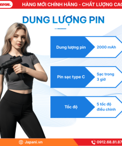 Với mỗi lần sạc đầy, thiết bị có thể hoạt động từ 1 đến 3 giờ, tùy thuộc vào cường độ và chế độ massage được sử dụng. Pin Lithium-ion nổi tiếng với mật độ năng lượng cao, trọng lượng nhẹ và khả năng duy trì hiệu suất ổn định, ít bị suy giảm dung lượng theo thời gian.