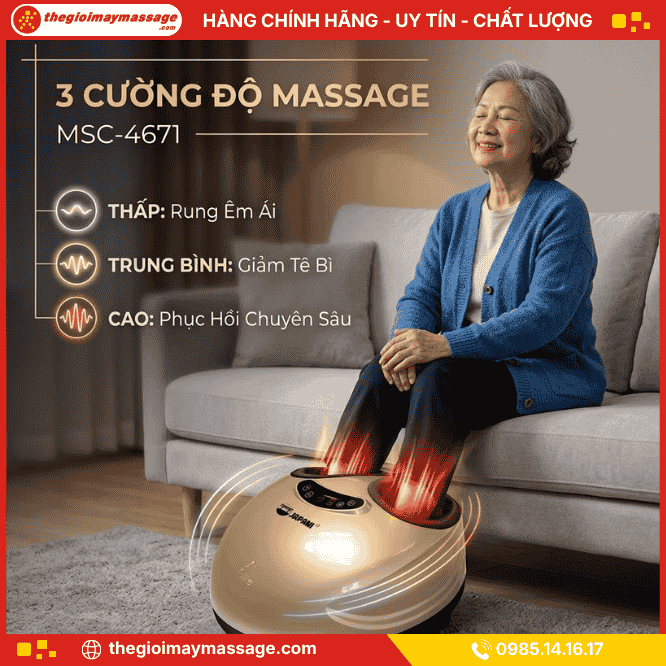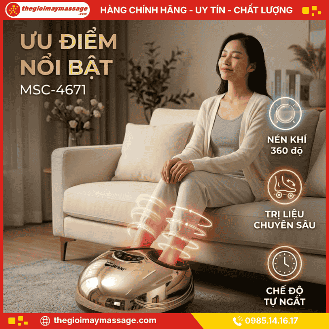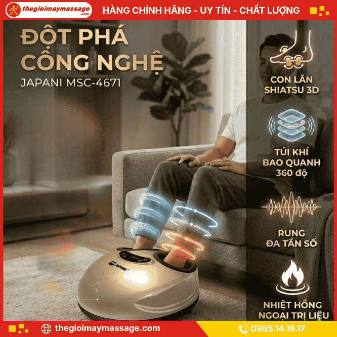 Máy massage chân JAPANI MSC-4671 đột phá với công nghệ Shiatsu 3D và túi khí nén khí chuyên sâu. Giải pháp hỗ trợ trị liệu viêm cân gan chân, suy giãn tĩnh mạch và tê bì bàn chân hiệu quả.