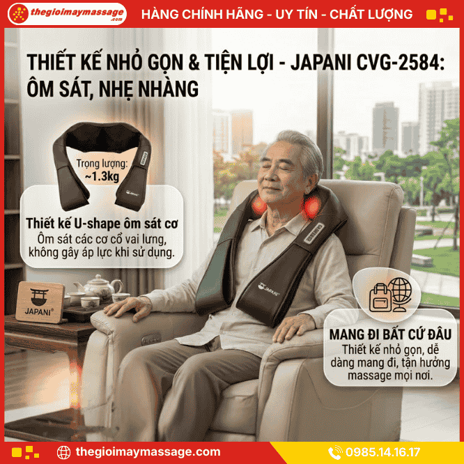 Với thiết kế nhỏ gọn và tiện lợi JAPANI CVG-2584 người dùng cũng có thể mang sản phẩm đi bất cứ đâu để có trải nghiệm massage thư giãn thoải mái.