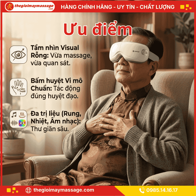 ✔ Tầm nhìn Visual rỗng giữa độc đáo: Khác với các loại máy che kín mắt gây cảm giác bí bách hoặc sợ hãi cho người dùng, MSM-1961 có thiết kế rỗng ở phần tròng mắt. Điều này cho phép bạn vừa massage vừa có thể quan sát xung quanh