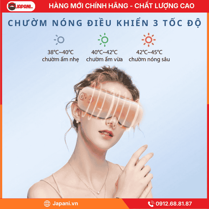 Máy massage mắt JAPANI E9 giúp thư giãn sâu với liệu pháp chườm nóng, áp suất khí và rung nhẹ nhàng. Hỗ trợ giảm căng thẳng, mệt mỏi và làm dịu đôi mắt.[hehe]