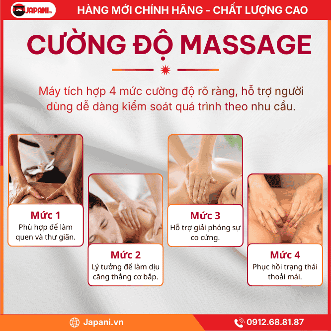 - Mức 2 (Vừa phải): Lý tưởng để làm dịu căng thẳng cơ bắp thông thường sau giờ làm việc.