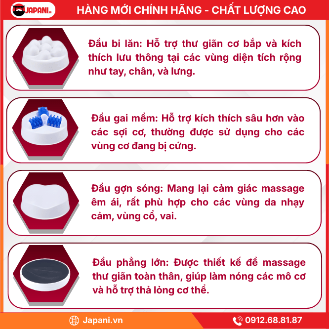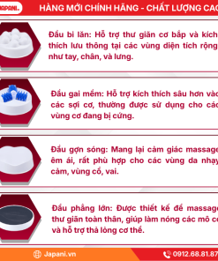Để tối ưu hóa hiệu quả cho từng loại mô cơ và khu vực trên cơ thể, JAPANI LUYAO MCT-4534 đi kèm bộ 4 đầu massage chuyên dụng, mang lại sự chăm sóc tỉ mỉ nhất: