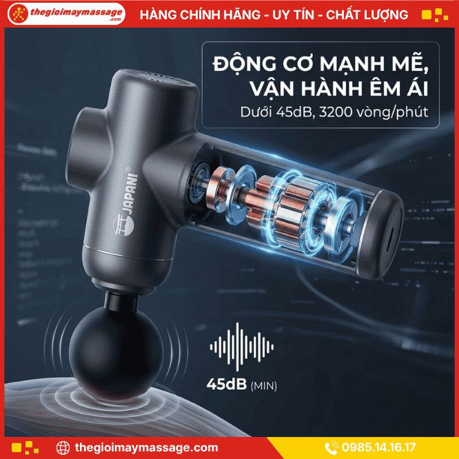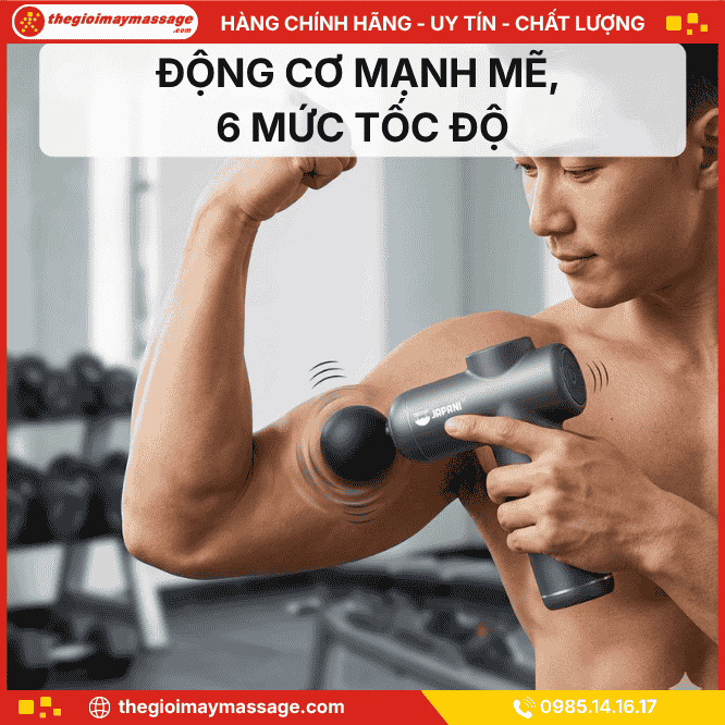 Súng massage JAPANI MCT-1913 sở hữu 6 đầu massage chuyên dụng và động cơ không chổi than siêu êm <45dB. Dải tốc độ 3200 RPM mạnh mẽ giúp đánh tan đau mỏi vai gáy và căng cơ tức thì.