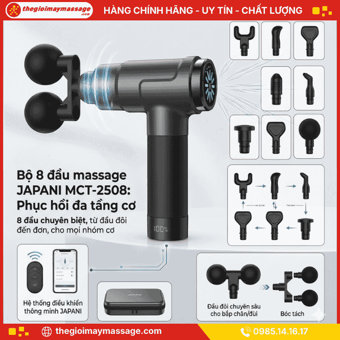 Súng massage cầm tay JAPANI MCT-2508 với 8 đầu trị liệu chuyên biệt và tần số rung 3200 vòng/phút. Giải pháp phục hồi cơ bắp, đánh tan axit lactic và giảm đau mỏi thần tốc cho vận động viên.